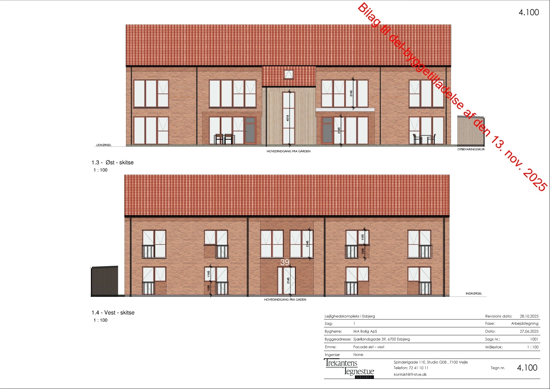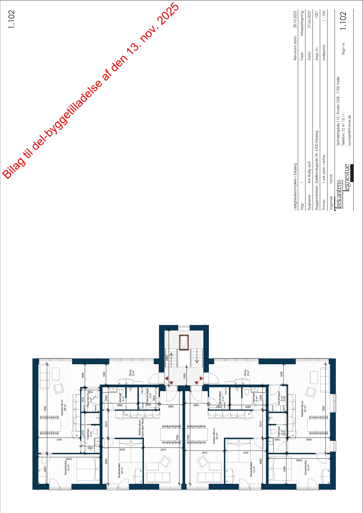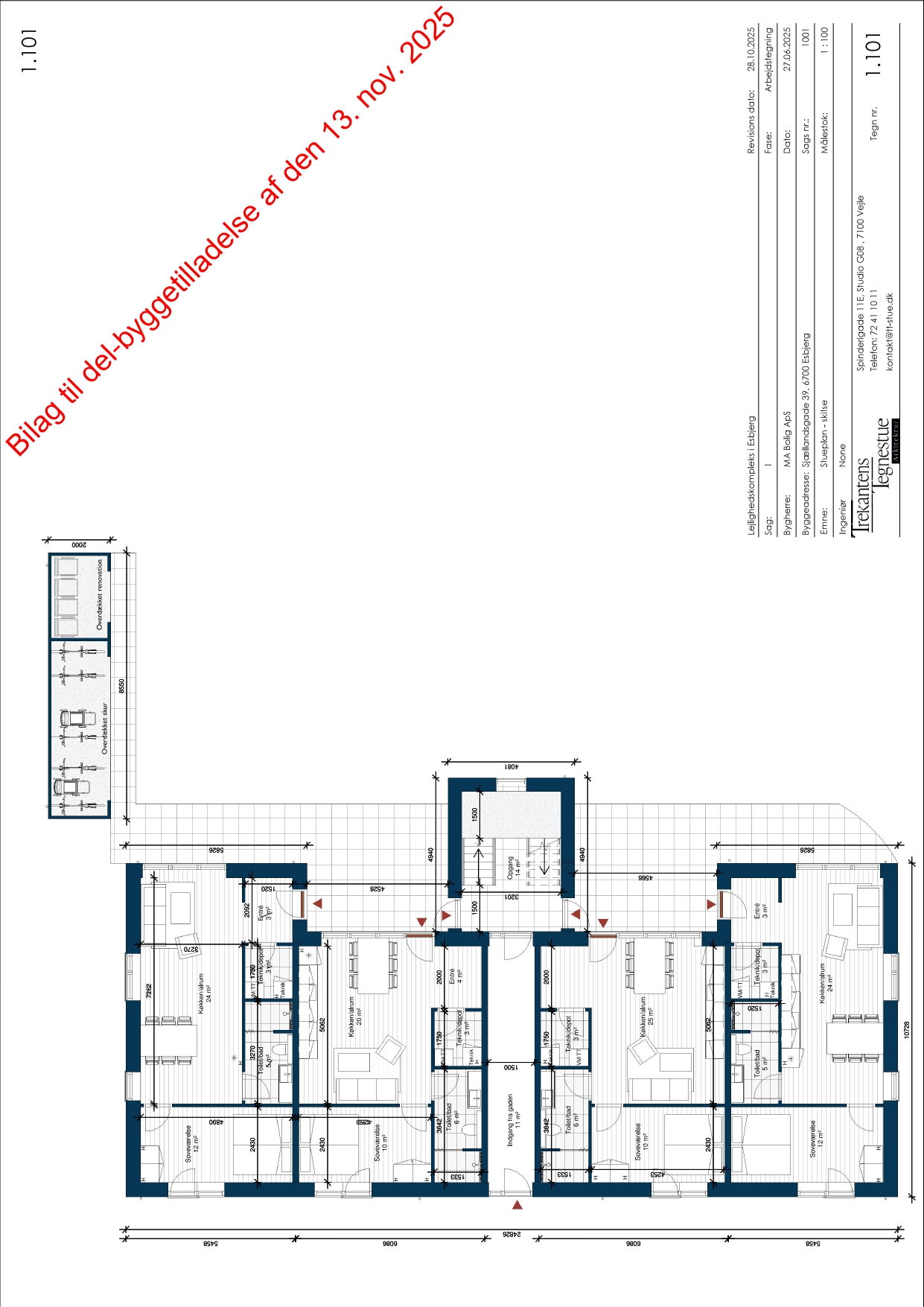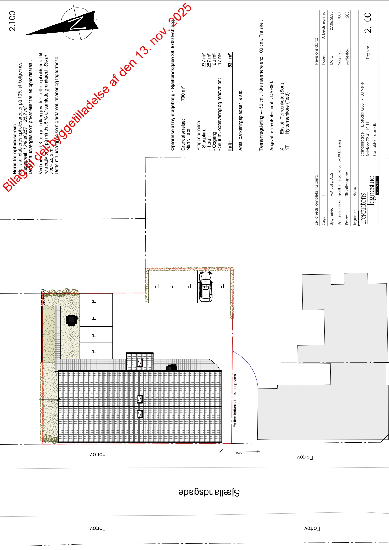 Der foreligger byggetilladelse til opførelse af et etagebyggeri i 2 plan med i alt 8 boliger. Projektet er disponeret med et estimeret areal på ca. 237 m² i stueplan og ca. 257 m² på 1. sal samt ca. 20 m² opgang, hvilket giver et samlet bebygget areal på ca. 514 m².